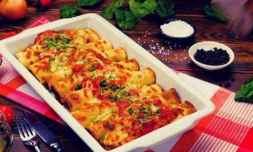 4 Dans 4 petits ramequins allant au four, déposez 3 cuillères à soupe de sauce tomate puis déposez les rouleaux de crêpes. Couvrez de papier aluminium et enfournez pendant 15 minutes. Enlevez le papier et laissez encore gratiner pendant 15 autres minutes.
